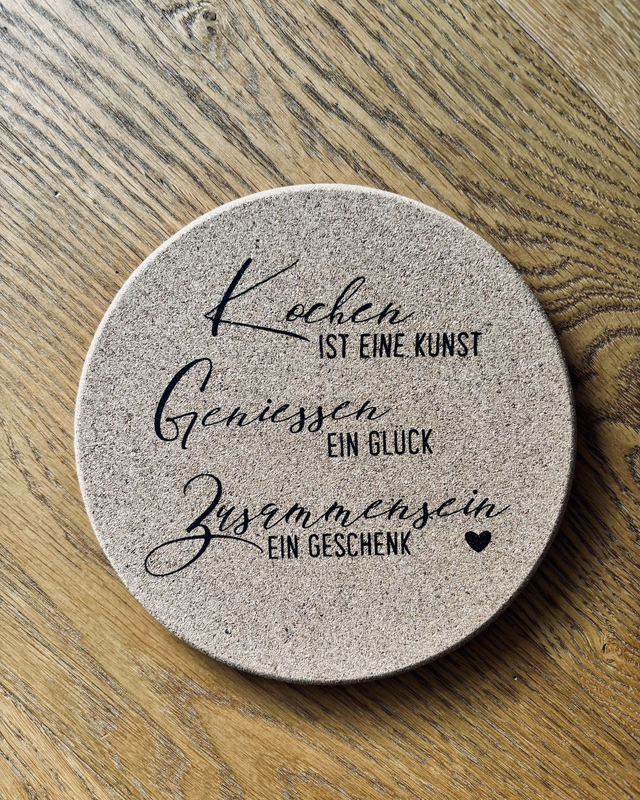 Dieser Topfuntersetzer aus Kork ist ein Dekoaccessoire für Küche und Essbereich. Der Kork verleiht jedem Stück eine warme, gemütliche Optik, während der geplottete Spruch einen persönlichen Akzent setzt.