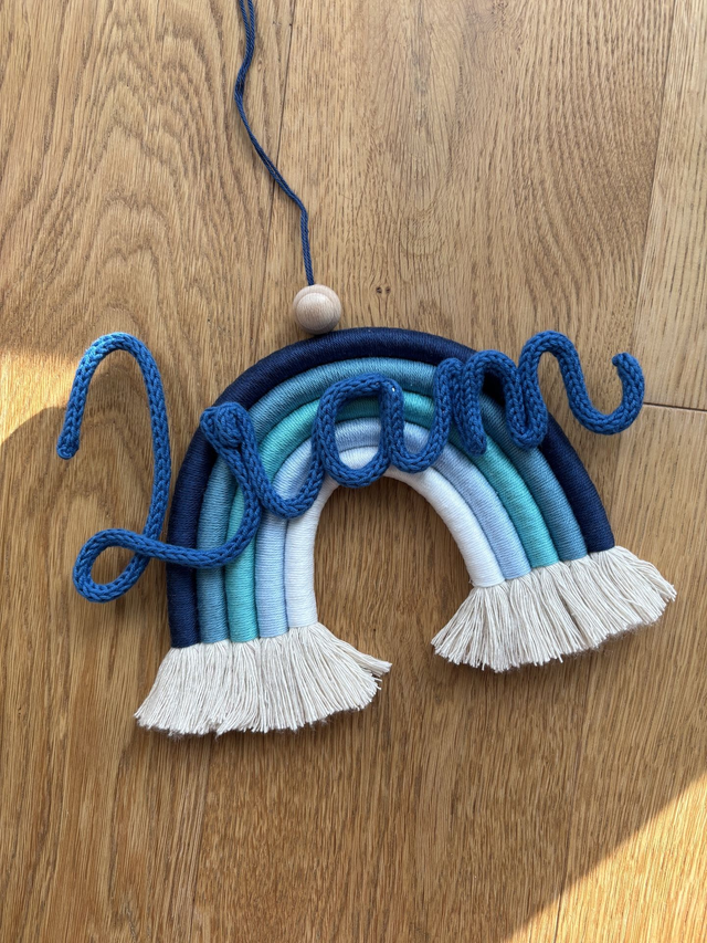 Dies ist ein Ausstellungsmodell und solche Regenbögen mit Stricknamen werden nicht mehr hergestellt. Ein "Liam" kann sich somit noch über das letzte Stück freuen.